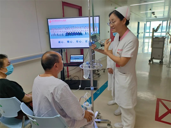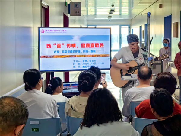 宣教會現場還充滿了溫暖的音符。崔智杰護士巧妙地將音樂療愈融入護理關懷,為在場患者深情彈唱了《隱形的翅膀》和《月亮代表我的心》。他表示:“醫護人員和家屬的心愿是一樣的,都期盼患者早日康復。希望音樂的感染力能為他們增添戰勝病魔的力量。”歌聲不僅傳遞了關懷,也進一步拉近了護患距離,增強了患者積極面對疾病的心理建設。