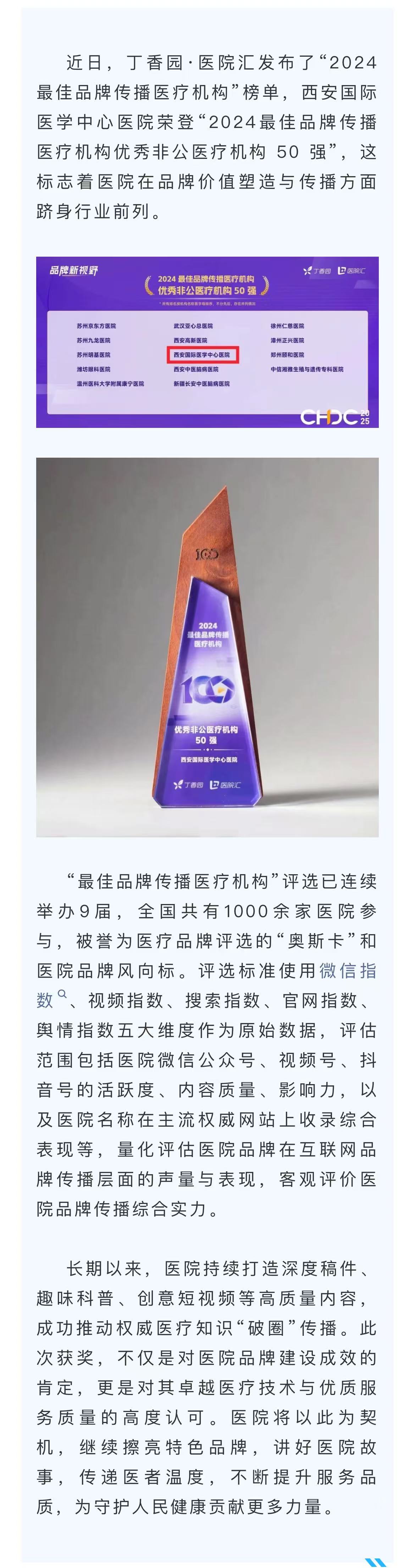 • 最佳民營醫療機構 西安國際醫學中心醫院為2020優秀非公醫療機構第1名,該稱號由丁香園發布“2020最佳品牌傳播醫療機構”綜合排行榜獲得。