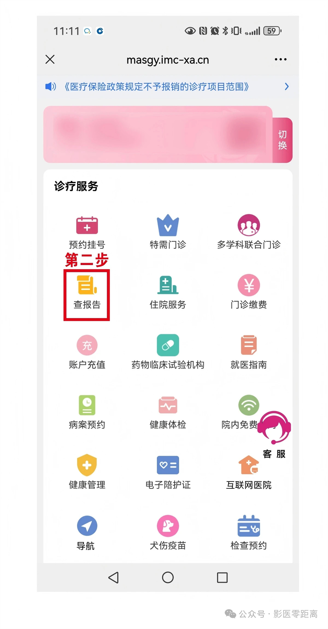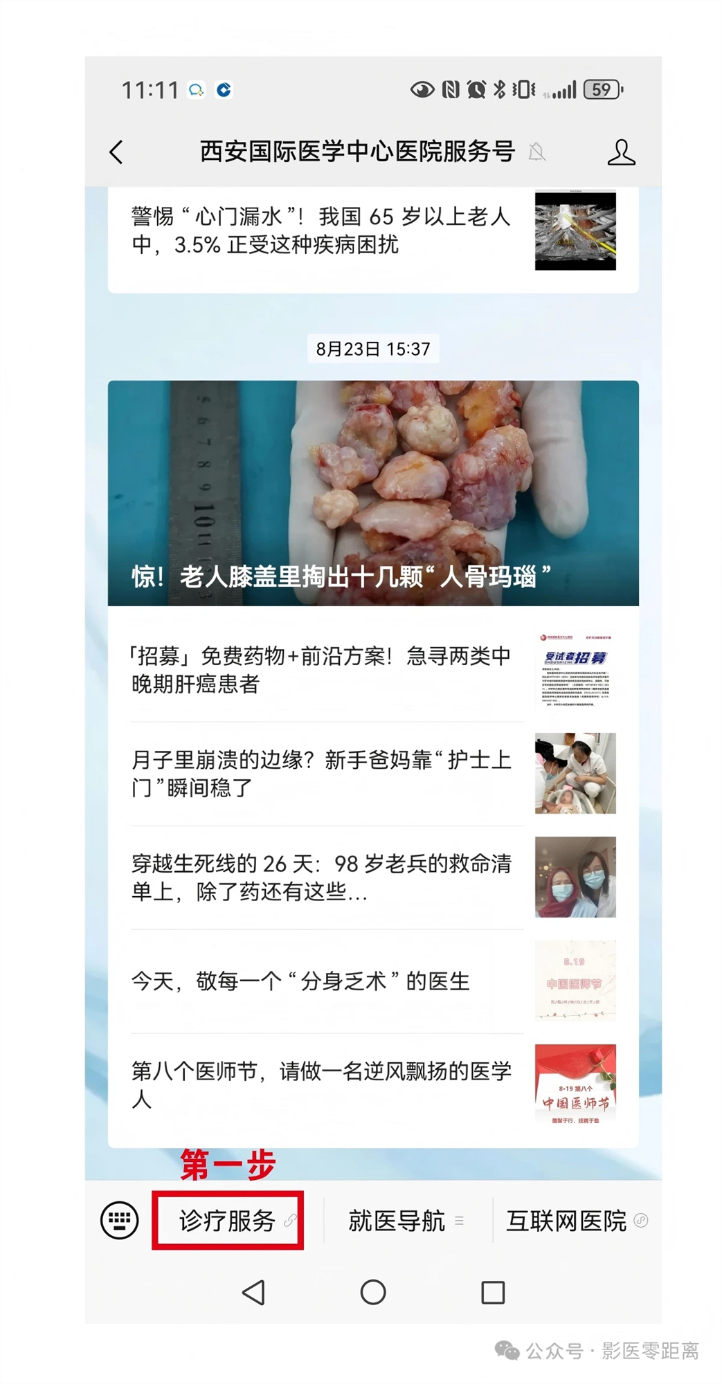 第一步:在醫院微信公眾號首頁,點擊底部菜單欄左側的【診療服務】入口