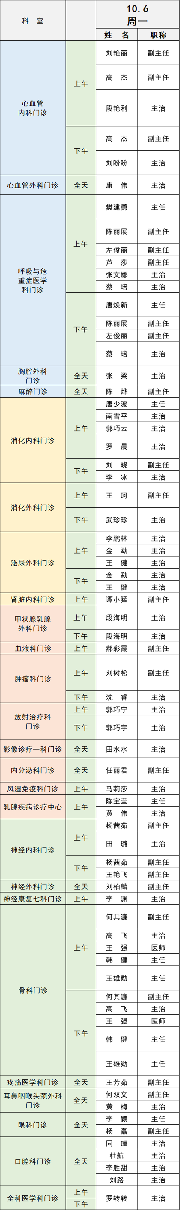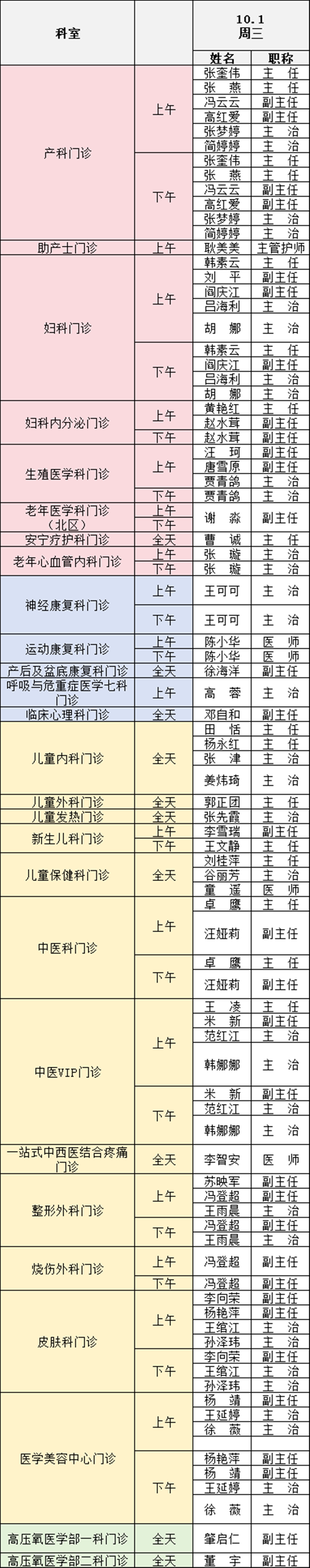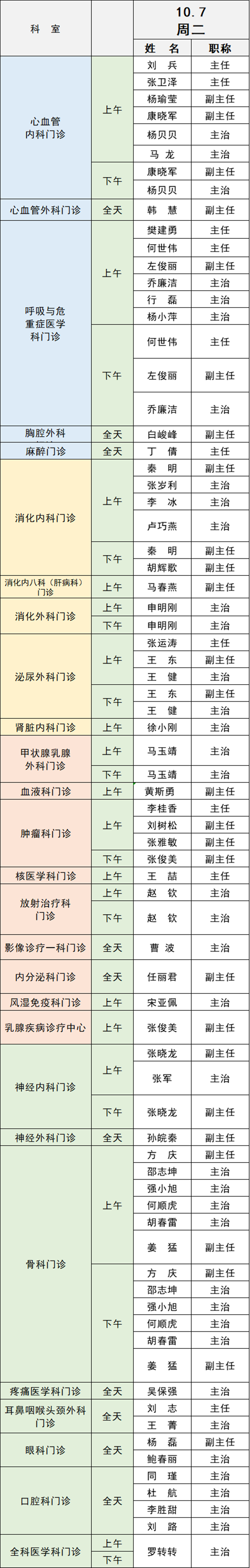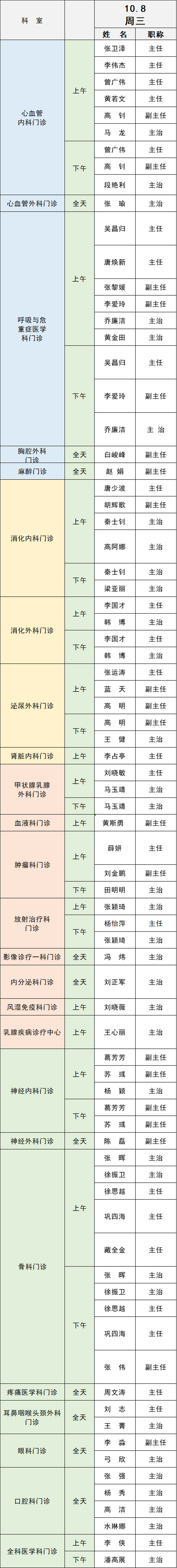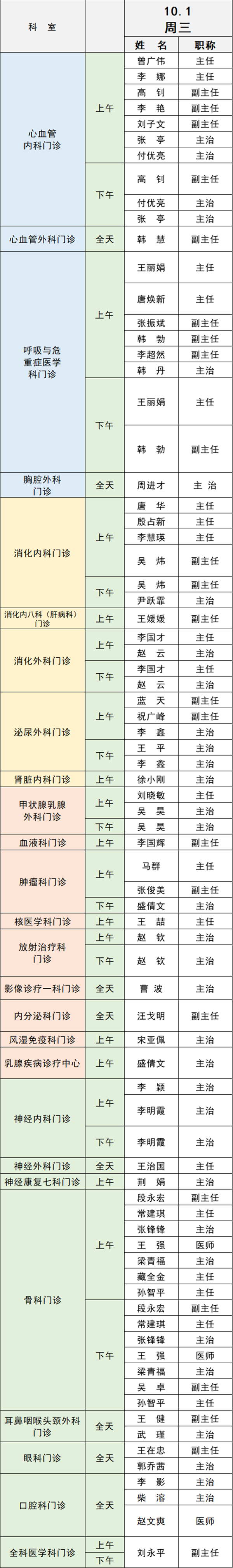 備注:實(shí)際出診情況以醫(yī)院掛號平臺實(shí)時(shí)信息為準(zhǔn)。“職稱”欄里主任=主任醫(yī)師副主任=副主任醫(yī)師主治=主治醫(yī)師