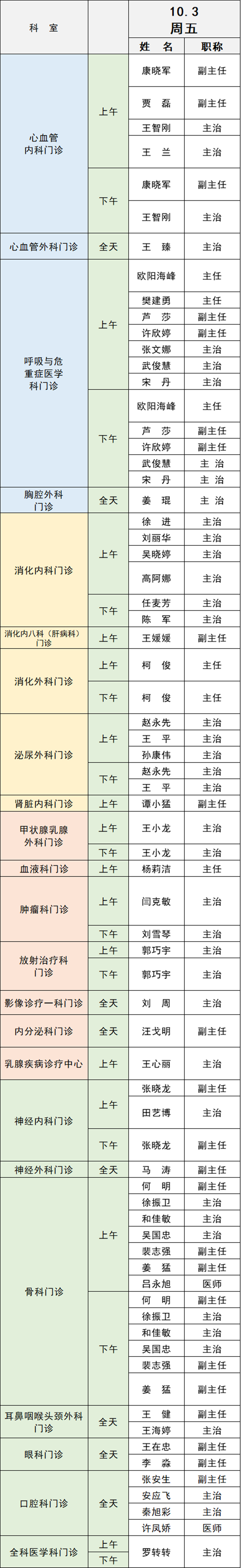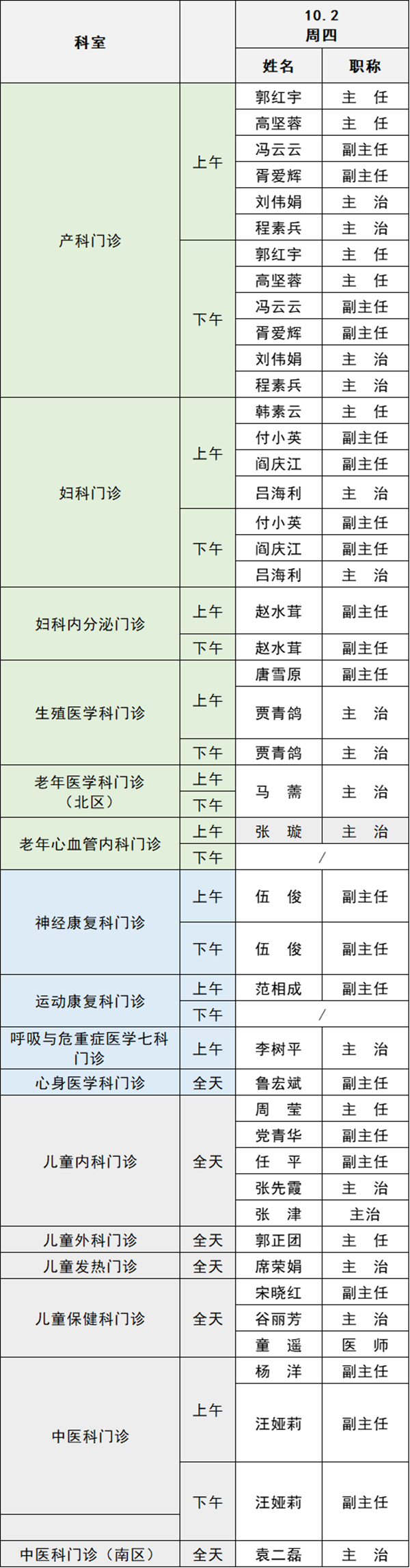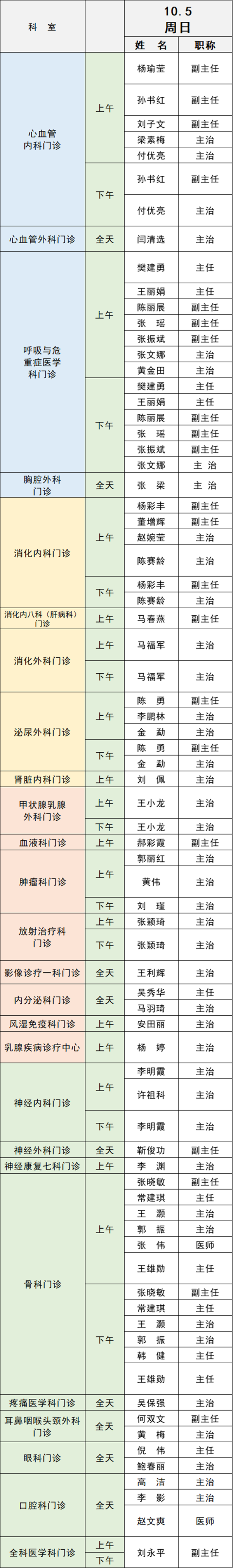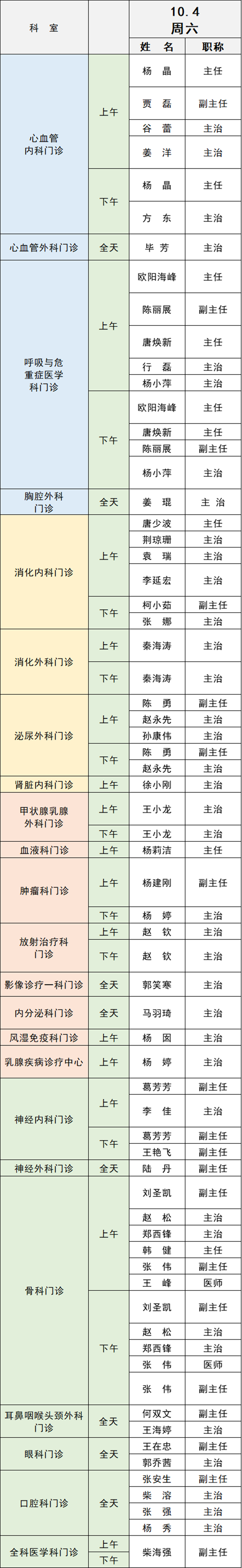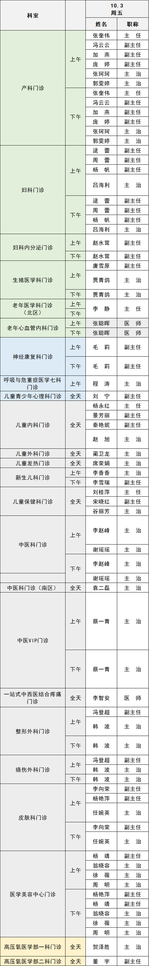 備注:實(shí)際出診情況以醫(yī)院掛號平臺實(shí)時(shí)信息為準(zhǔn)。“職稱”欄里主任=主任醫(yī)師副主任=副主任醫(yī)師主治=主治醫(yī)師